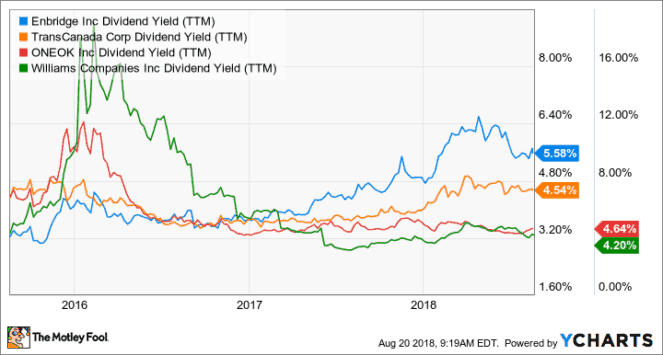 As it stands, Enbridge’s dividend yield of 5.8% is now higher than that of large-cap counterparts like TransCanada, ONEOK, and Williams Companies.