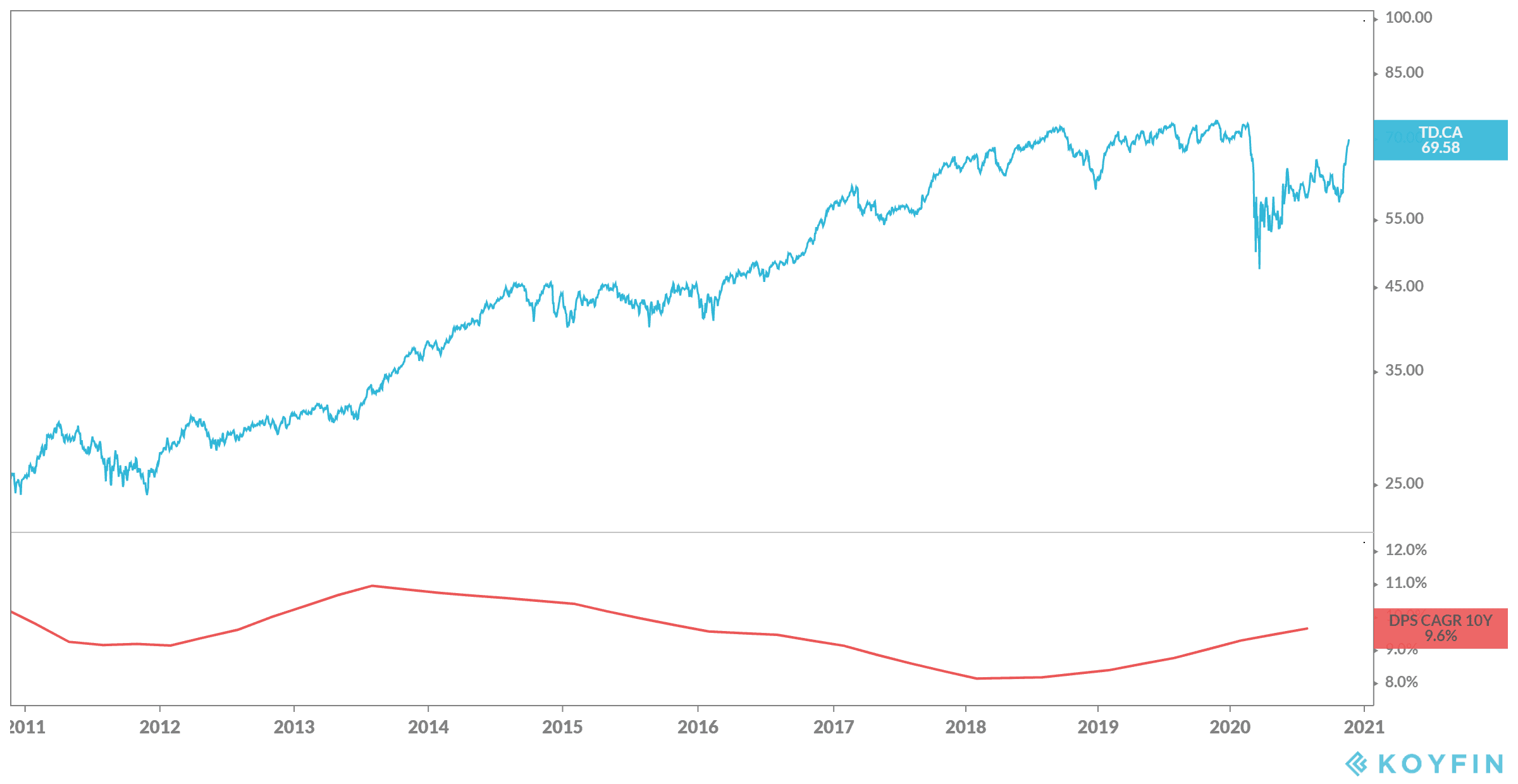 While shares aren’t at the discount prices a few months back, shares are still well below fair value. Stock prices are 5% lower than pre-crash levels and 55% higher than five years ago. Over the last decade, the company has seen a compound annual growth rate (CAGR) of 10.54%! Meanwhile, TD Bank recently increased its dividend reaching 4.57% for a CAGR of 9.6% in the last decade. If you had invested $10,000 in TD a decade ago, your portfolio would now be worth $102,279.15!