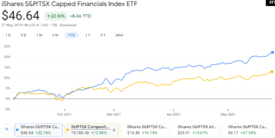 So far in 2021, TSX banks have beaten the market by a wide margin. As the chart below shows, they have nearly doubled the TSX.