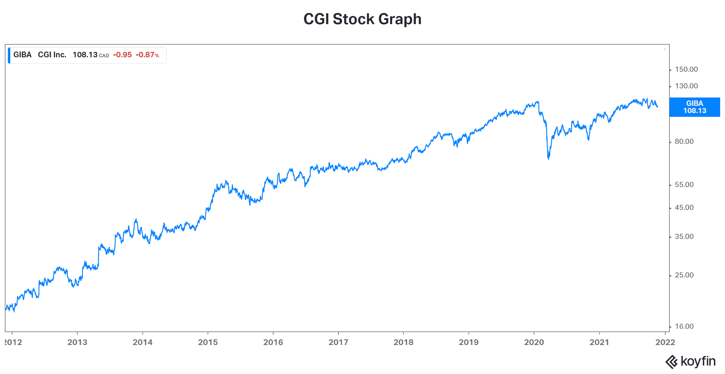 CGI stock is currently trading at $109. It’s had a spectacular ride over the last decade. As we can see from the graph below, it’s been a steady climb higher.