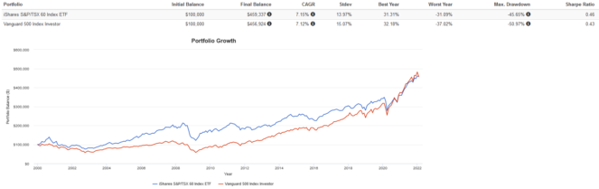 XIU has done very well over its lifetime. Below is a backtest from 2000 to present with all dividends reinvested versus the venerable U.S. S&P 500 Index. They’re both neck and neck in terms of risk and return. Notice that most of the outperformance of the S&P 500 came in recent years, with XIU doing better in the years prior.
