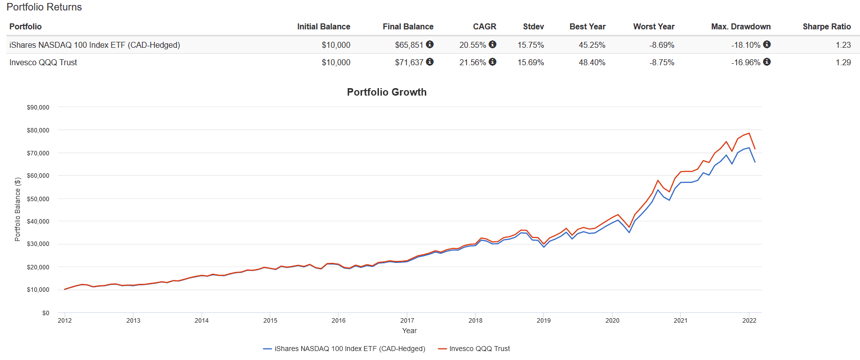 The backtest below shows that although XQQ tracks QQQ closely, it does underperform over time by around 1%. This is due to its higher MER and the cost of the currency hedging. Otherwise, the funds are virtually identical in terms of volatility, drawdowns, and risk-adjusted returns.
