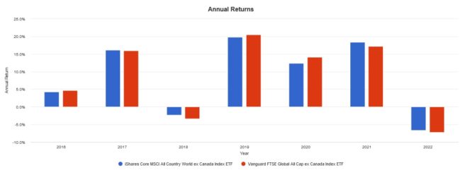 Up for consideration today are Vanguard FTSE Global All Cap ex Canada Index ETF (TSX:VXC) and iShares Core MSCI All Country World ex Canada Index ETF (TSX:XAW).