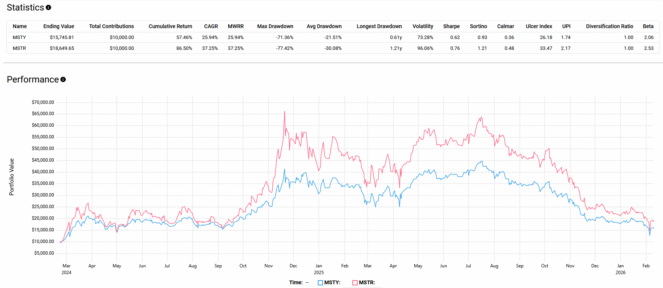 Let’s look at the period from February 22, 2024, to February 10, 2026. If you bought MSTY and reinvested every single distribution, assuming no taxes and perfect execution, you would have earned a cumulative return of 57.5%. That sounds solid.