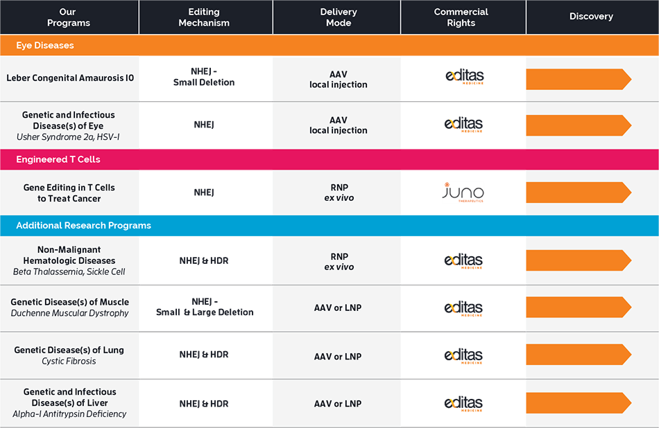 Editas’s mission is to address the root cause of diseases caused by mutations in our DNA. To that end, the company is working on cures for cancer, as well as for diseases of the eye, blood, muscle, lung, and liver by harnessing a natural immune defense called CRISPR.